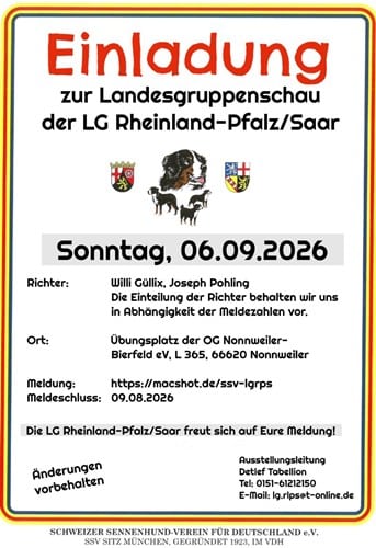 Wann: 27. September 2025 Wo: Übungsplatz der OG Nonnweiler-Bierfeld eV, L 365, 66620 Nonnweiler Richter: Herr Dr. Hollensteiner Leiter: Herr Detlef Tabellion, Tel: 0151-61212150, E-Mail: lg.rlps@t-online.de Zahlungsempfänger: SSV-LG Rheinland-Pfalz/Saar, IBAN: DE57 5425 0010 0005 0020 84, BIC: MALADE51SWP Verwendungszweck: LG-Einzelbegutachtung 2025 + Name des Hundes lt. Ahnentafel Online-Meldungen: https://macshot.de/ssv-lgrps