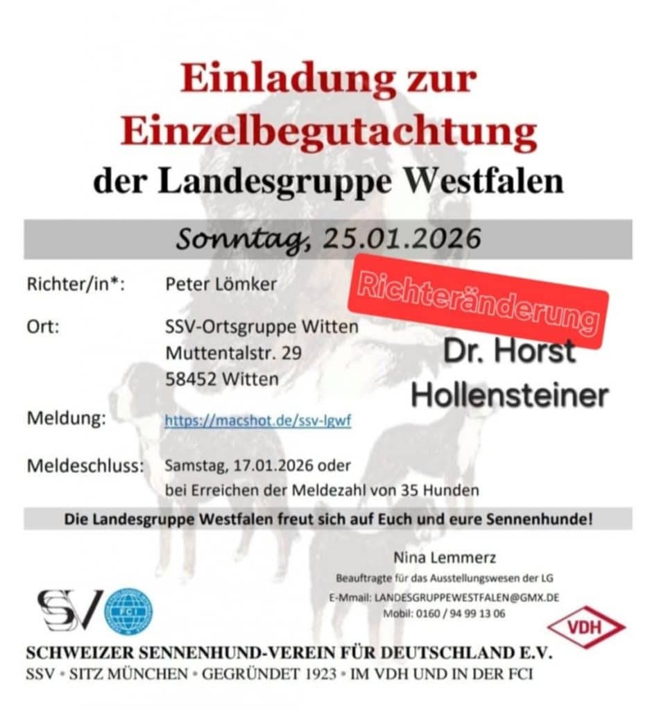 Die Landesgruppe Westfalen lädt alle Sennenhund-Besitzer zum 1. Event des Jahres, die Einzelbegutachtung, in der OG Witten herzlich ein.